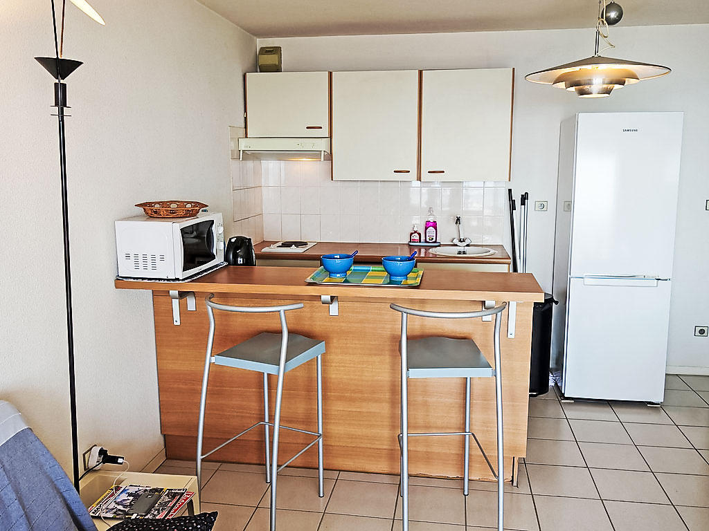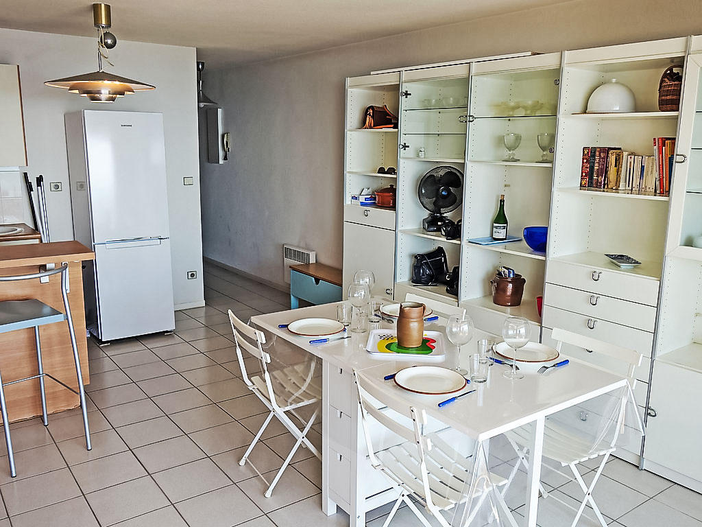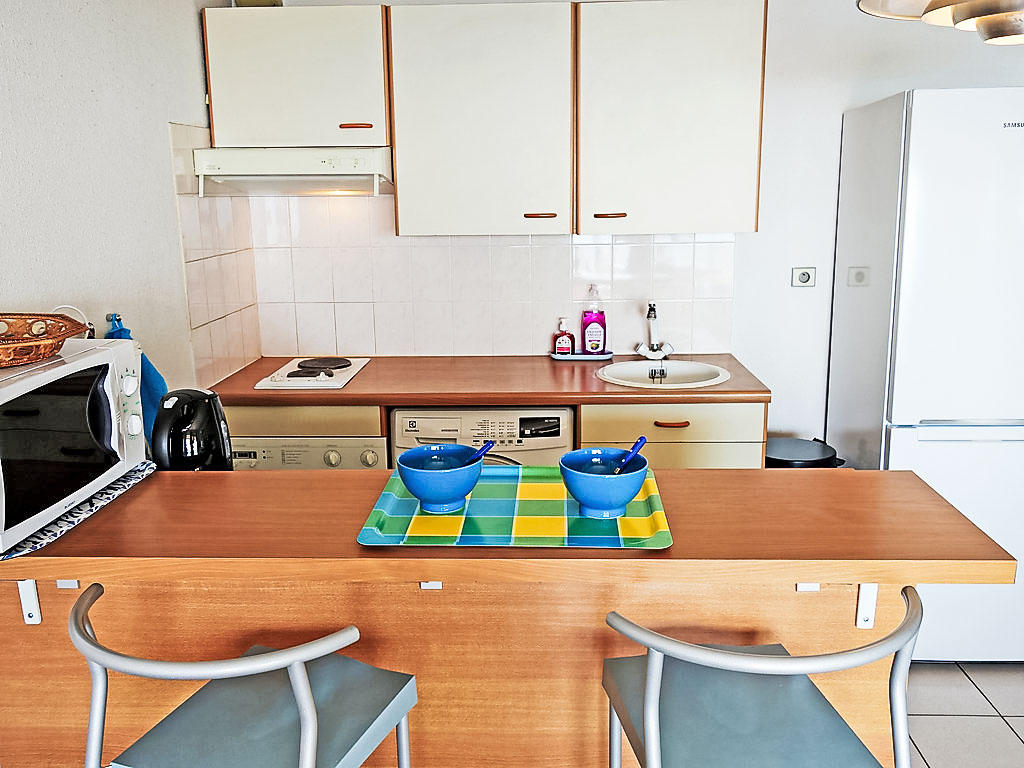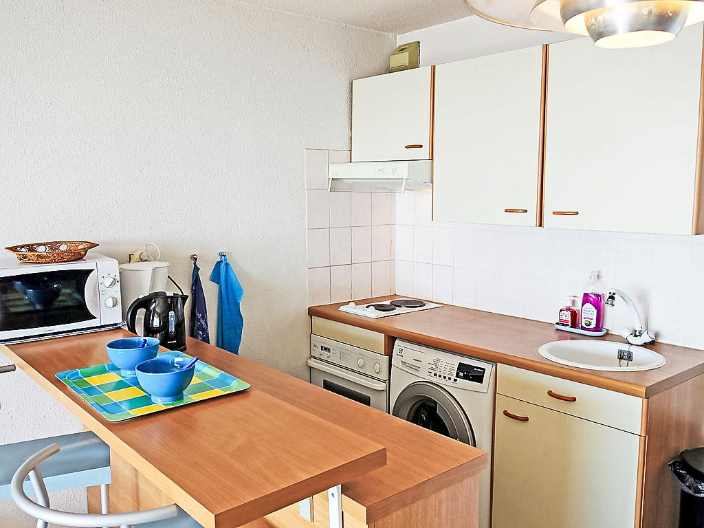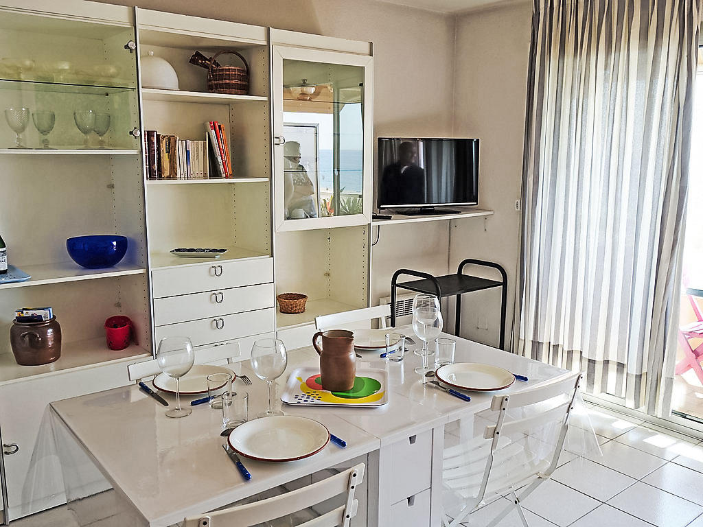 Apt 2 pièces 40 m2 au 4ème étage. Aménagement agréable: séjour/salle à manger avec 1 divan-lit double (140 cm, longueur 190 cm), table pour les repas et TV (écran plat), lecteur CD. Sortie sur la terrasse. 1 chambre avec 1 lit double (140 cm, longueur 190 cm). Cuisine ouverte (four, 2 plaques vitrocéramiques, grille-pain, bouilloire électrique, micro-ondes, congélateur, cafetière électrique) avec radio et ventilateur. Douche/WC. Chauffage électrique. Petite terrasse 7 m2. Meubles de terrasse. Vue sur la mer. A disposition: lave-linge, fer à repasser, sèche-cheveux. Internet (Connexion WIFI, en sus). Veuillez noter: maximum 1 animal/ chien autorisé. Détecteur de fumée.