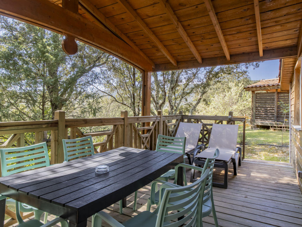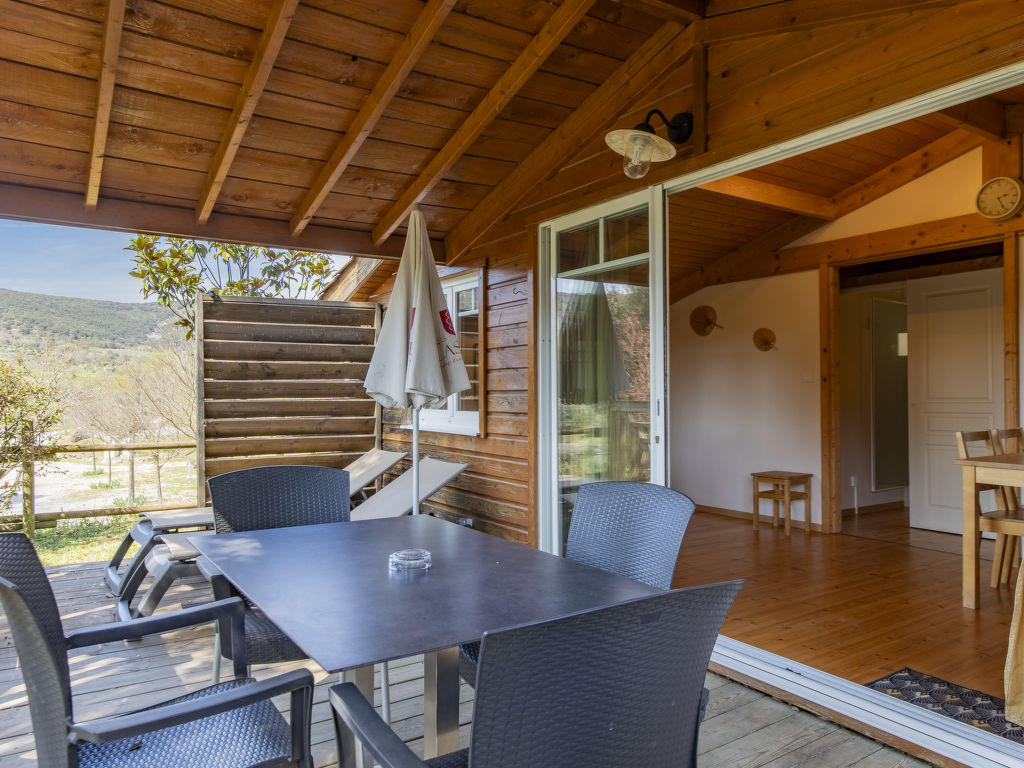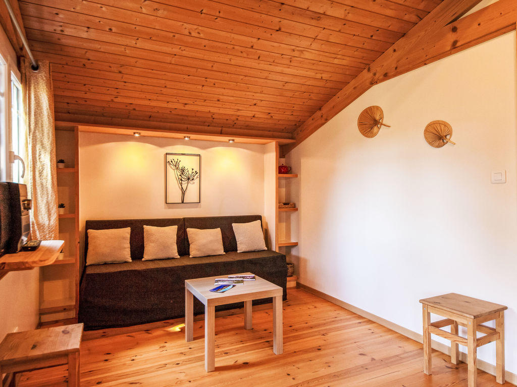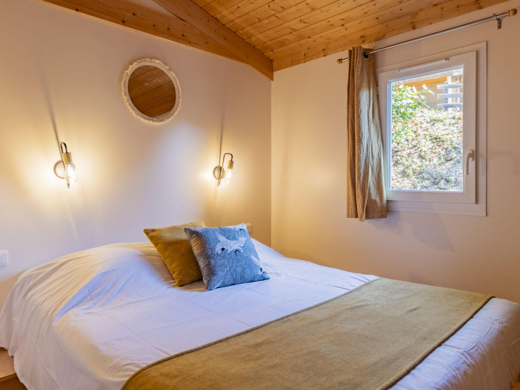 « Domaine de Sévenier », bungalow 3 pièces 35 m2. Clair, aménagement avec beaucoup de bois: séjour/salle à manger avec table pour les repas. Sortie sur la terrasse. 1 chambre avec 1 grand-lit (140 cm). 1 chambre avec 2 lits (80 cm), 1 x 1 lits superposés (80 cm). Coin cuisine (lave-vaisselle, 3 feux, grille-pain, bouilloire électrique, micro-ondes, congélateur, cafetière électrique). Douche, WC séparé. Chauffage électrique, air-conditionné. Sol en parquet. Terrasse 12 m2, couverte, jardin 100 m2. Meubles de terrasse. Vue sur le jardin et la forêt. A disposition: chaise haute pour enfant, lit bébé, sèche-cheveux. Internet (Connexion WIFI, gratuit). Place de parking (1 Voiture). Veuillez noter: logement non-fumeur. Maximum 2 animaux/ chiens autorisés.