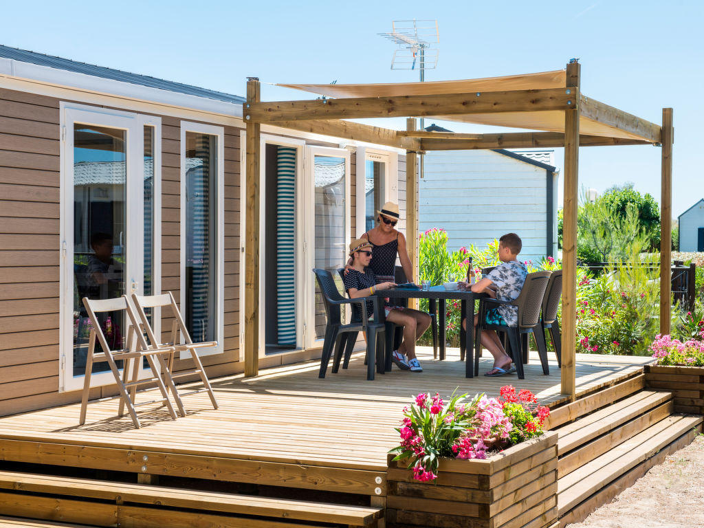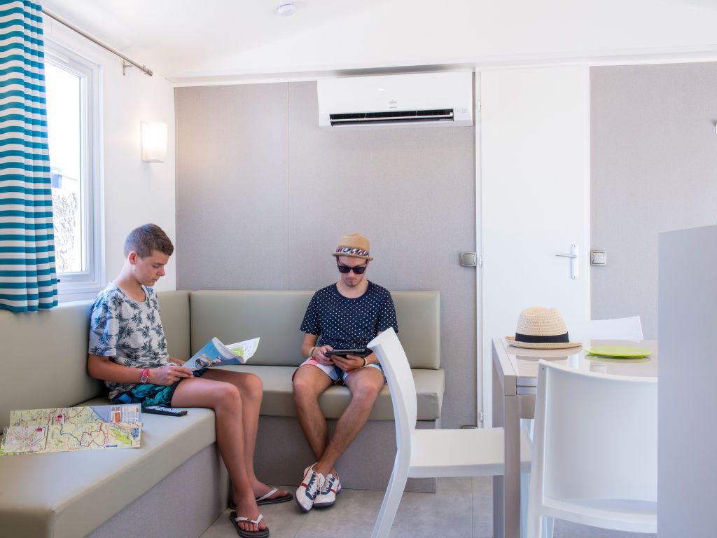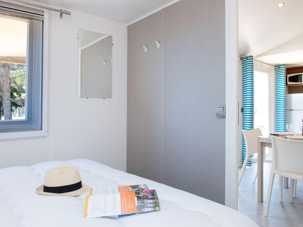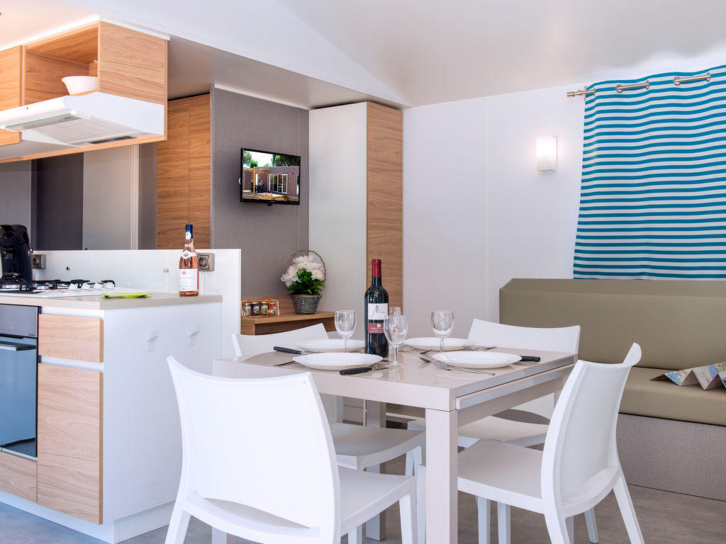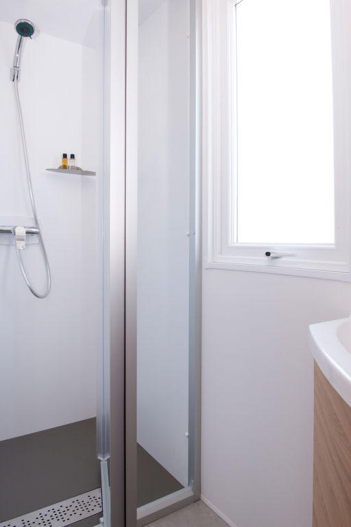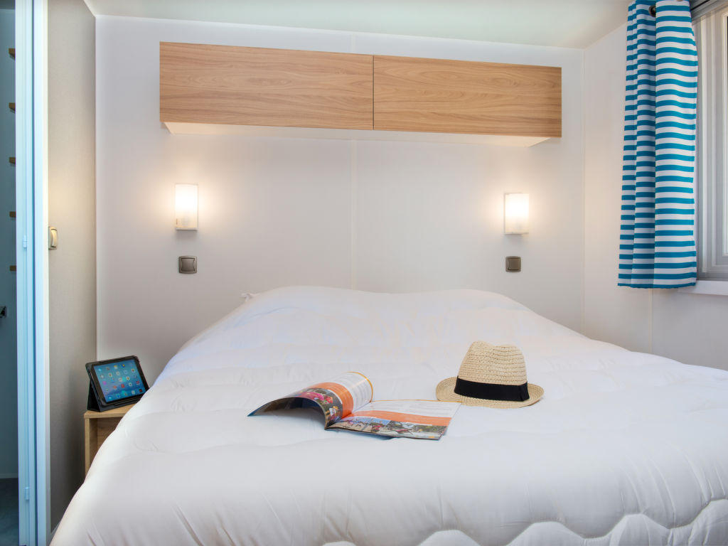 « Domaine Les Mûriers », 3 pièces mobil home 34 m2. Aménagement moderne et plaisant: séjour/salle à manger avec table pour les repas et TV (écran plat), air-conditionné. 1 chambre avec 1 grand-lit (160 cm, longueur 200 cm), douche/WC. 1 chambre avec 2 lits (80 cm, longueur 190 cm). Sortie sur la terrasse. Cuisine ouverte (four, lave-vaisselle, 4 feux, micro-ondes, congélateur, cafetière électrique, Capsules pour machine à café (Senséo)). Douche, WC séparé. Chauffage électrique. Terrasse 10 m2. Meubles de terrasse. A disposition: Internet (Connexion WIFI, en sus). Place de parking (1 Voiture) près de la maison. Veuillez noter: maximum 2 animaux/ chiens autorisés. Détecteur de fumée. Annonce d’un professionnel (art 155, IV du CGI)