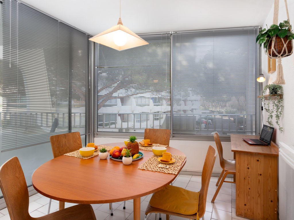 Apt 2 pièces 35 m2 au 1er étage. Logement idéal pour 2 adultes + 2 enfants. Séjour/salle à manger avec 1 divan-lit double (140 cm, longueur 200 cm), TV (écran plat). 1 chambre d’enfants avec 1 x 2 lits superposés (90 cm, longueur 190 cm). Coin cuisine (2 plaques de cuisson, mini-four, grille-pain, bouilloire électrique, micro-ondes, cafetière électrique). Baignoire sabot, WC séparé. Terrasse 6 m2, situation sud-ouest. Meubles de terrasse. Vue latérale sur le jardin. A disposition: Internet (Connexion WIFI, gratuit). Veuillez noter: pas de parking. 1 animal/ chien de petite taille autorisé. Détecteur de fumée.