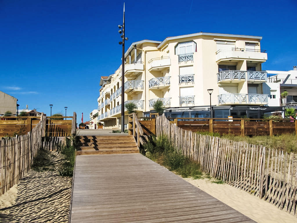 Mimizan-Plage: Résidence « Grand Pavois », de 3 étages, année de construction 1987. Dans la localité, à 100 m du centre de Mimizan Plage, situation centrale, animée, à 100 m de la mer, à 10 km du lac, à 100 m de la plage, à 30 m de la rivière. Infrastructures de la résidence: ascenseur. Magasins 100 m, magasin d’alimentation 150 m, supermarché 600 m, restaurant 10 m, bar 100 m, boulangerie 150 m, location de bicyclettes 300 m, arrêt de bus 450 m, gare ferroviaire « Labouheyre » 30 km, plage de sable « la garluche » 150 m, parc « Landes Aventure » 6 km, piscine couverte 6 km, baignade en lac « Aureilhan » 10 km. Terrain de golf (9 trous) 6 km, ecole de surf 350 m, centre équestre 10 km. Attractions à proximité: Bordeaux 120 km, Arcachon 70 km, Biscarrosse 40 km, Centre Nautique 7 km, Casino Mimizan Plage. Région de randonnées: Parc naturel régional des Landes 45 km.