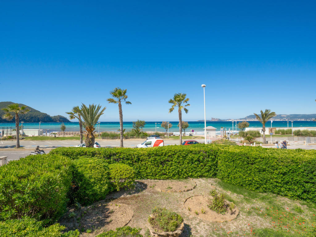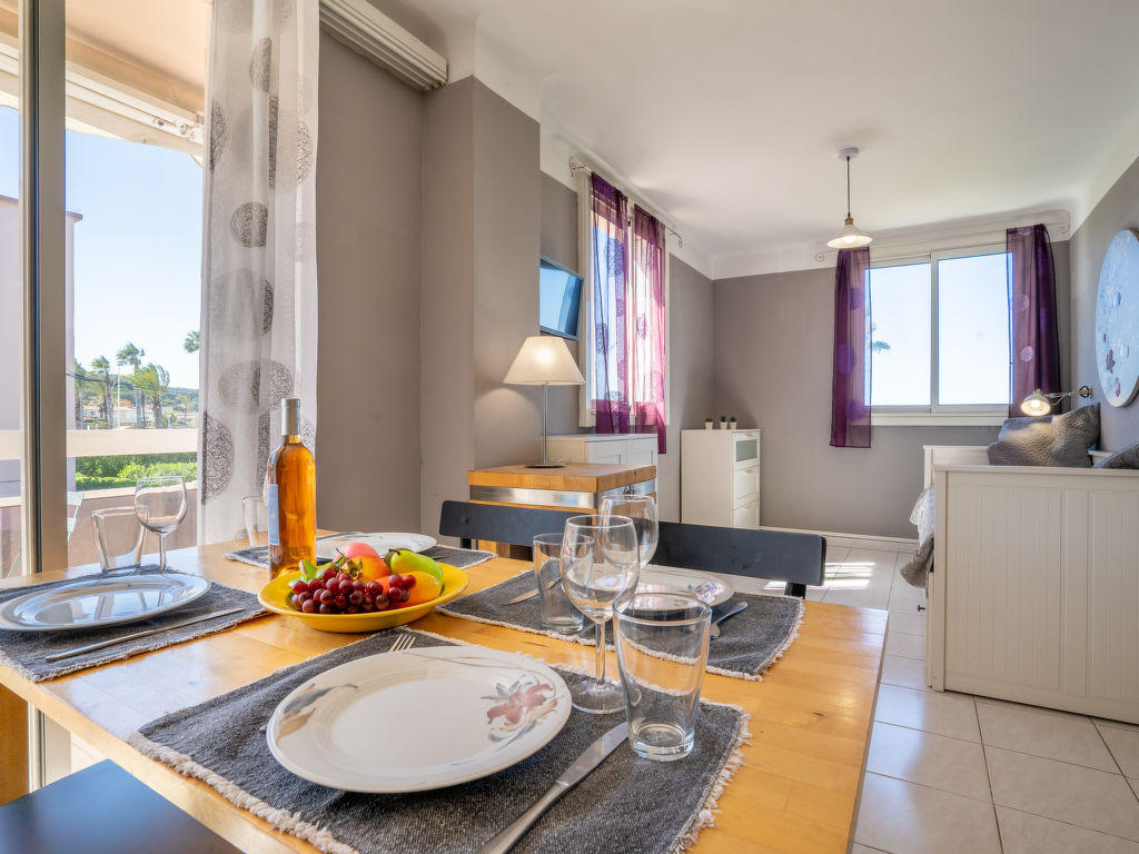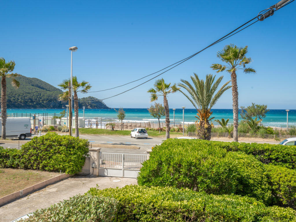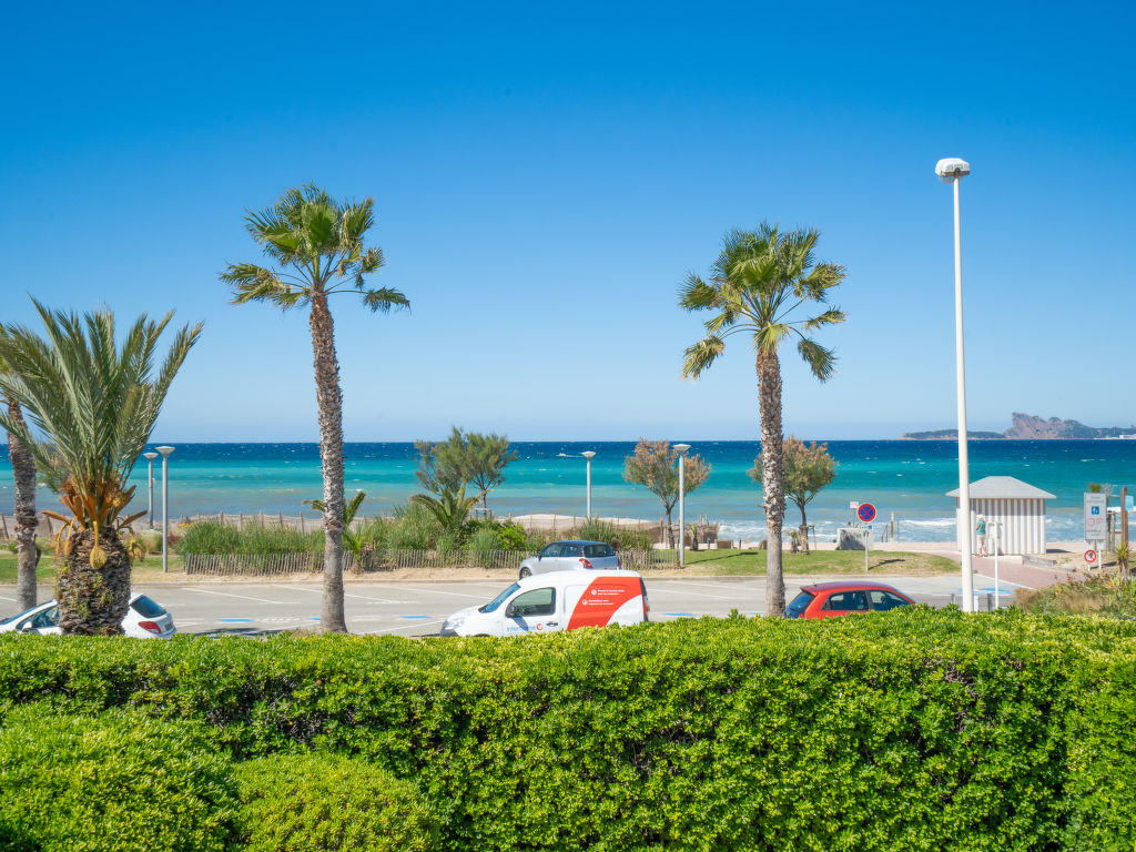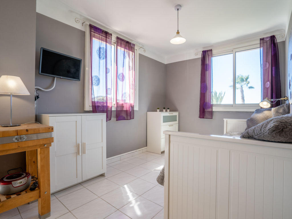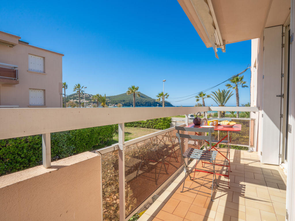 Studio 30 m2 au 1er étage. Aménagement simple: séjour/salle à manger avec 1 lit gigogne (2 x 80 cm, longueur 200 cm), TV. Sortie sur la terrasse. Coin cuisine (2 plaques vitrocéramiques, grille-pain, bouilloire électrique, micro-ondes, congélateur, cafetière électrique, Capsules pour machine à café (Senséo) (NON INCLUSES)). Douche/WC. Chauffage électrique. Terrasse 5 m2, couverte, situation sud-est. Meubles de terrasse. Vue latérale sur la mer. A disposition: lave-linge, fer à repasser. Internet (Connexion WIFI, en sus). Place de parking No 5. Veuillez noter: maximum 1 animal/ chien autorisé. TV seulement FR. Détecteur de fumée. 83112 000179 QU