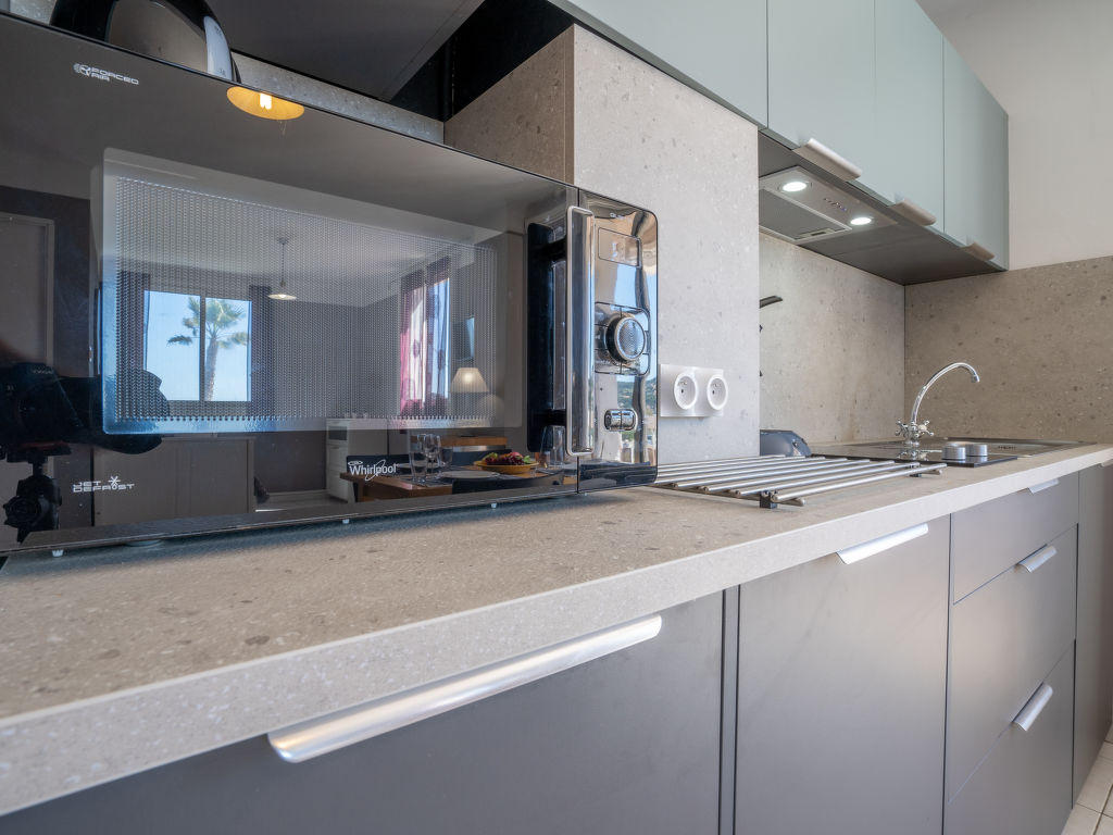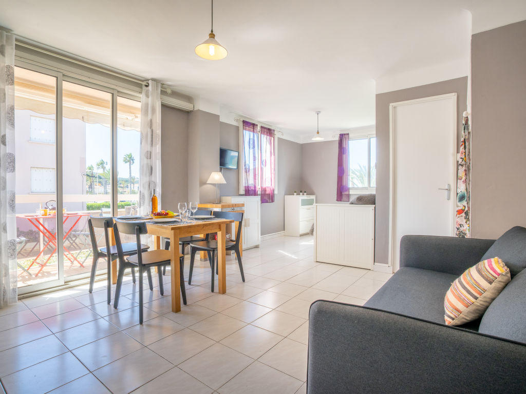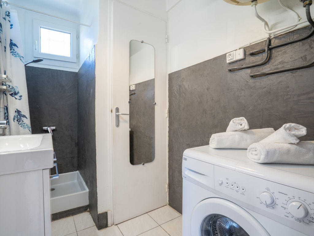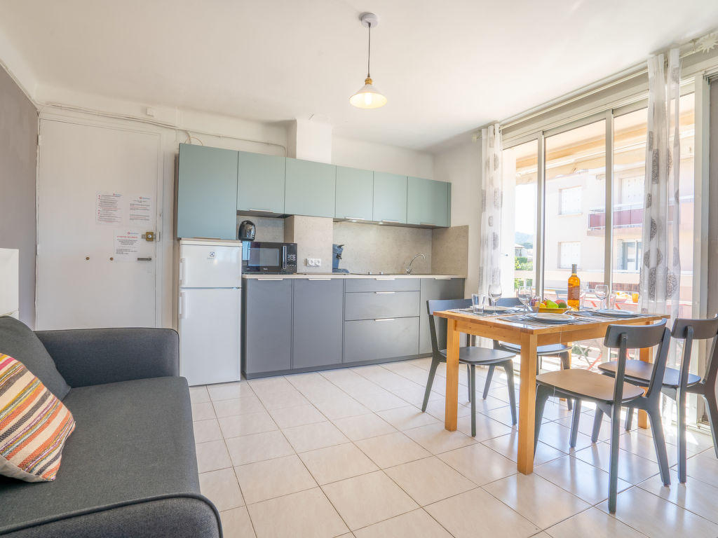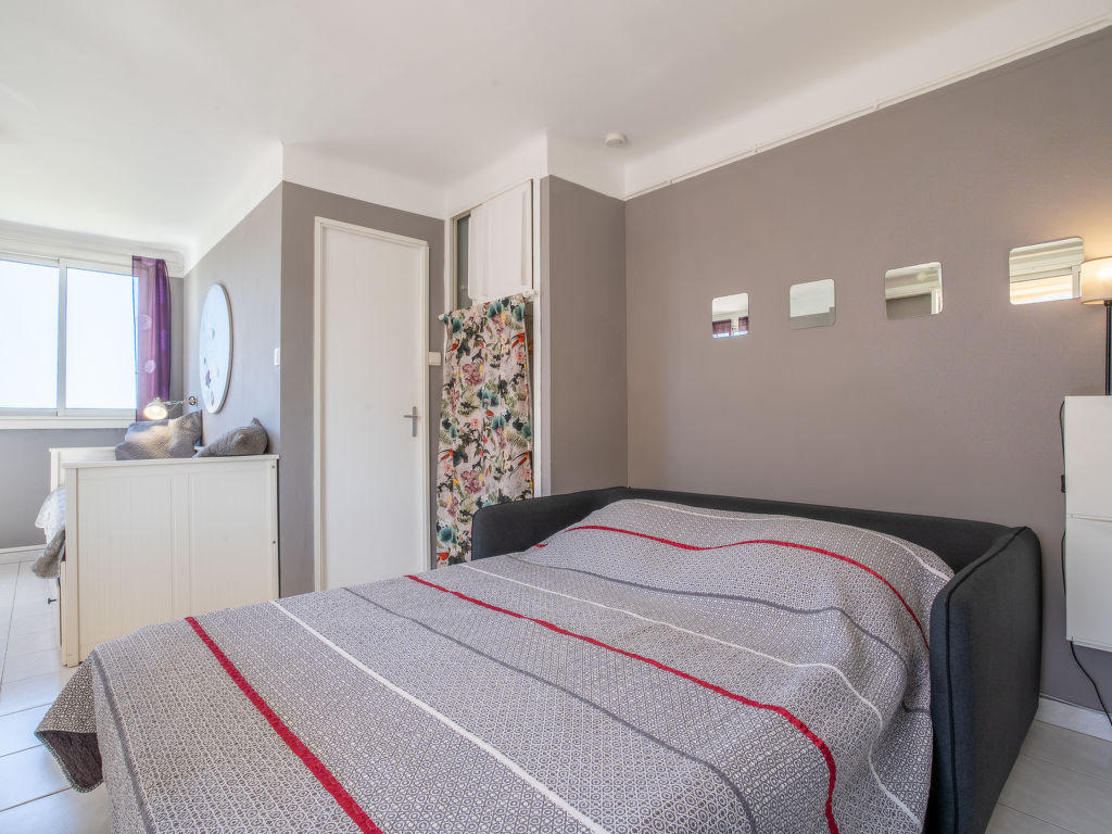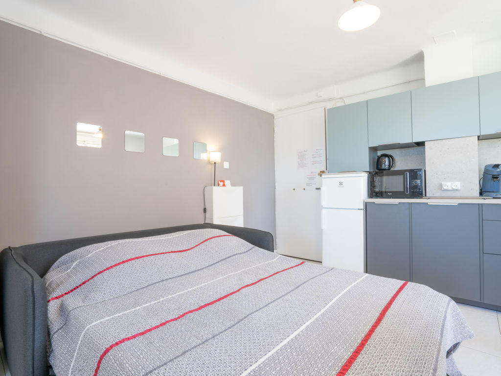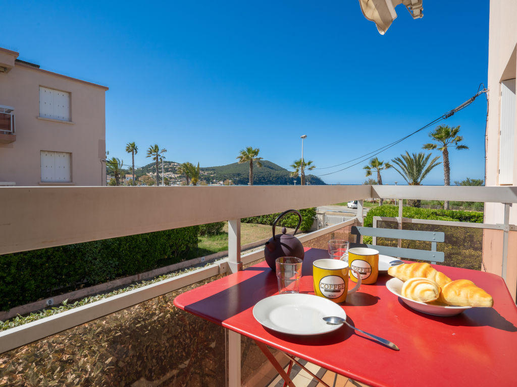 Studio 30 m2 au 1er étage. Aménagement simple: séjour/salle à manger avec 1 lit gigogne (2 x 80 cm, longueur 200 cm), TV. Sortie sur la terrasse. Coin cuisine (2 plaques vitrocéramiques, grille-pain, bouilloire électrique, micro-ondes, congélateur, cafetière électrique, Capsules pour machine à café (Senséo) (NON INCLUSES)). Douche/WC. Chauffage électrique. Terrasse 5 m2, couverte, situation sud-est. Meubles de terrasse. Vue latérale sur la mer. A disposition: lave-linge, fer à repasser. Internet (Connexion WIFI, en sus). Place de parking No 5. Veuillez noter: maximum 1 animal/ chien autorisé. TV seulement FR. Détecteur de fumée. 83112 000179 QU