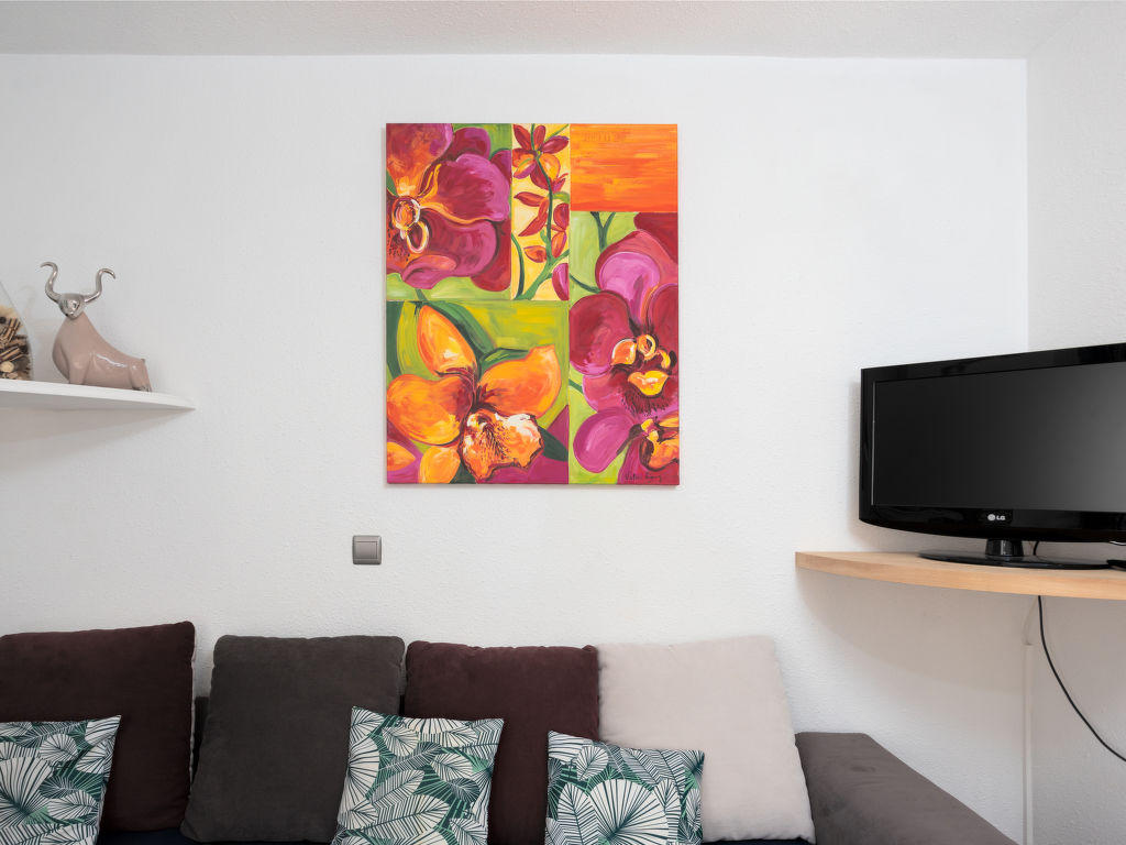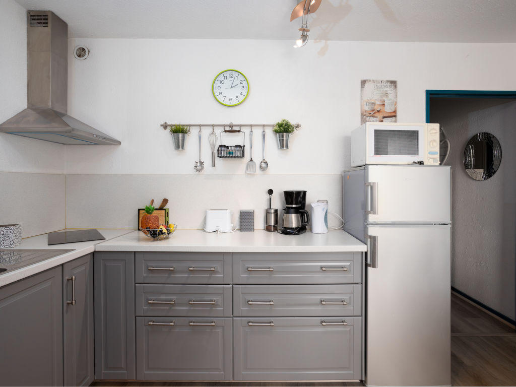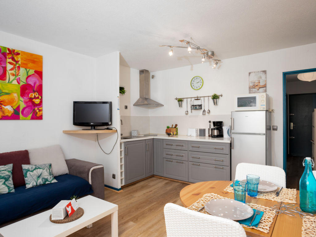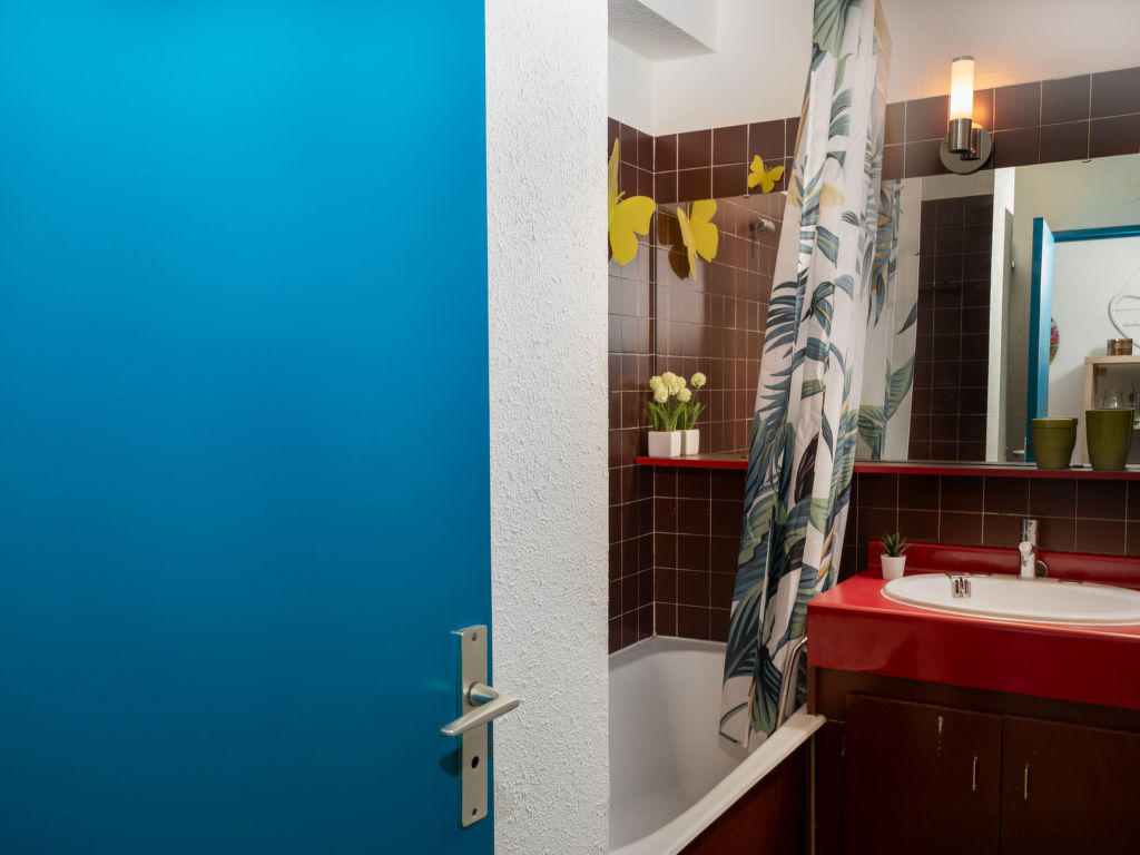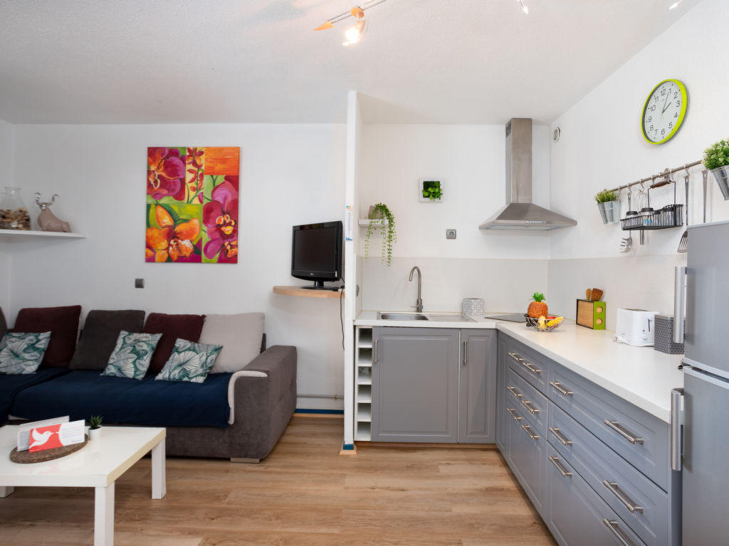 Apt 2 pièces 35 m2 au 3ème étage, situation est. Rénové, aménagement confortable et moderne: séjour/salle à manger avec 1 divan-lit double (140 cm, longueur 190 cm), TV (écran plat), air-conditionné. 1 chambre avec 1 grand-lit (140 cm, longueur 190 cm). Cuisine ouverte (mini-four, 2 plaques vitrocéramiques, grille-pain, bouilloire électrique, micro-ondes, congélateur, cafetière électrique). Bain/WC. Terrasse 7 m2 partiellement couverte, situation est. Meubles de terrasse. Vue sur les alentours. A disposition: Internet (Connexion WIFI, en sus). Garage, hauteur 178 cm, largeur 230 cm. Veuillez noter: logement côté cour. Maximum 1 animal/ chien autorisé. Détecteur de fumée. FR6618.717.1