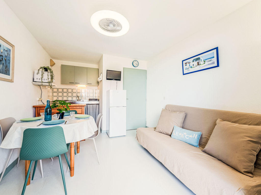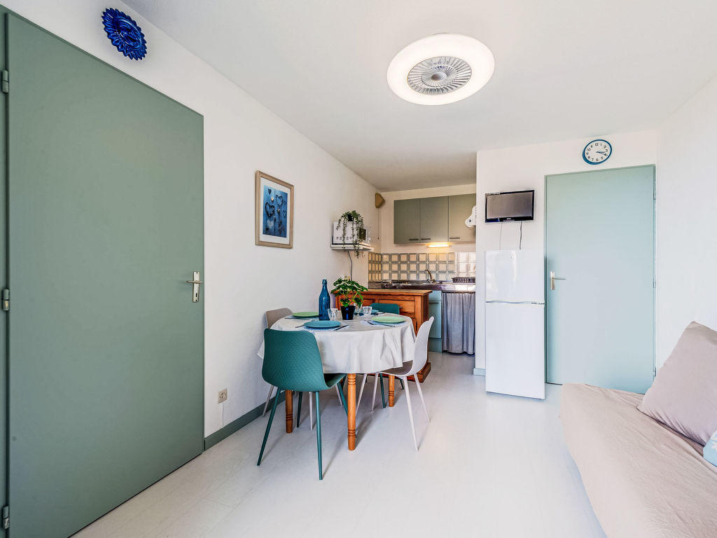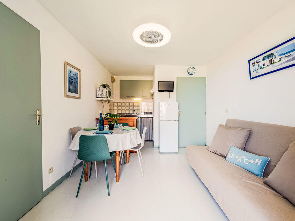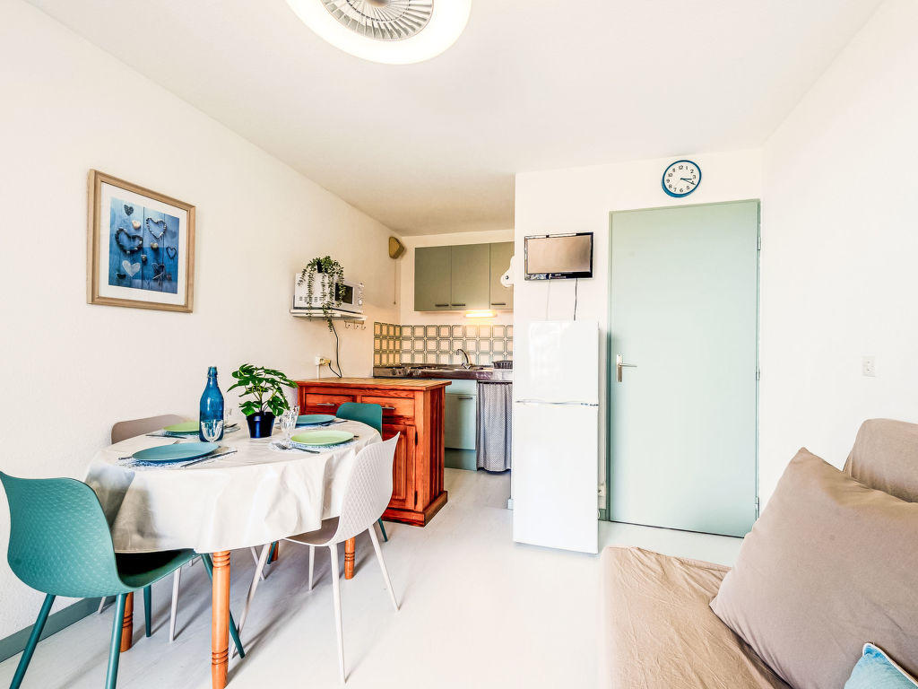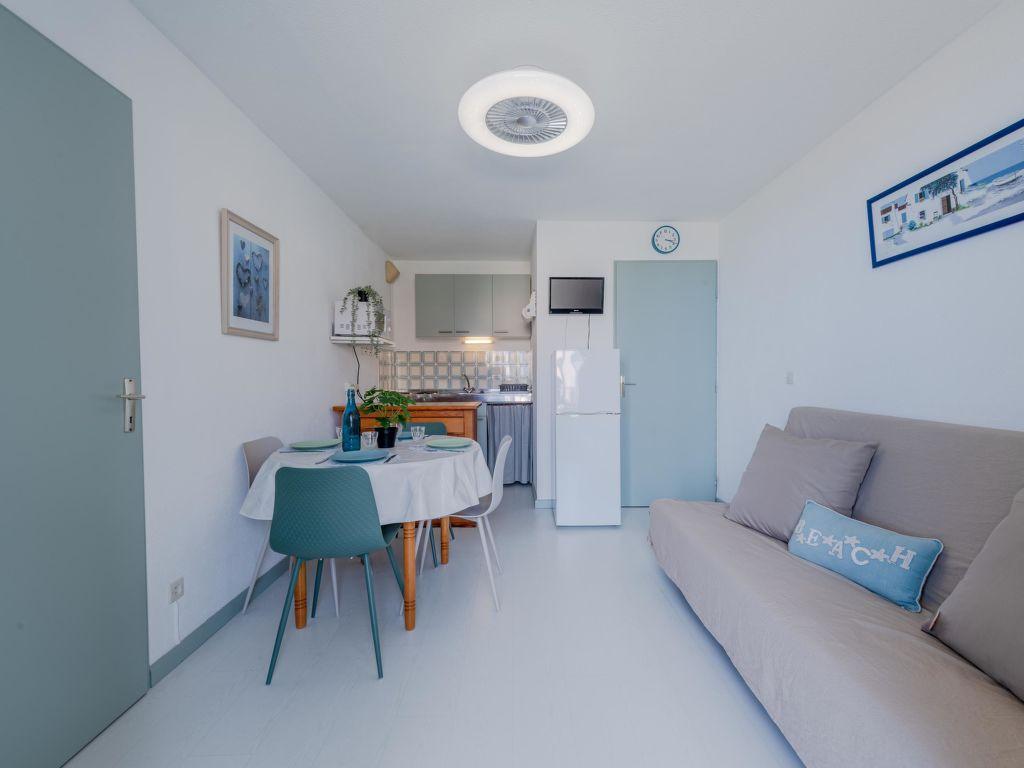 Apt 2 pièces 25 m2 au 1er étage. Aménagement agréable: séjour/salle à manger avec 1 divan-lit double (140 cm, longueur 190 cm), TV (écran plat), DVD. Sortie sur la loggia. 1 chambre avec 1 lit (120 cm, longueur 190 cm), 1 x 1 lits superposés (90 cm, longueur 190 cm). Coin cuisine (3 plaques de cuisson, four, micro-ondes, congélateur, cafetière électrique). Douche/WC. Pas de chauffage. Mobilier de balcon. Vue latérale sur la mer. A disposition: lave-linge, fer à repasser, sèche-cheveux. Internet (Connexion WIFI, en sus). Veuillez noter: maximum 1 animal/ chien autorisé. Détecteur de fumée. Loggia vitrée. Annonce d’un particulier (art 155, IV du CGI). FR6640.430.5