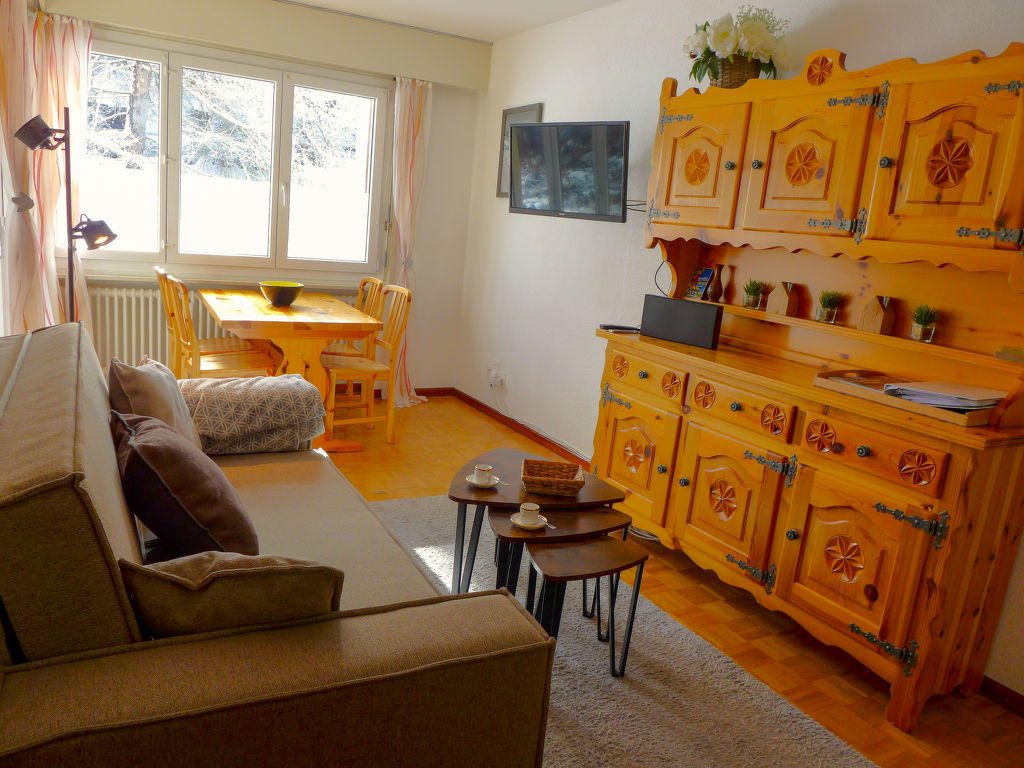 « Résidence du Golf A 07 », apt 2 pièces 36 m2, au rez-de-chaussée, situation est. Partiellement rénové en 2022, aménagement confortable et agréable: séjour/salle à manger avec TV (câblée), écran plat et radio. Sortie sur la terrasse, orientée est. 1 chambre avec 1 grand-lit (1 x 160 cm, longueur 200 cm). Cuisine (3 plaques de cuisson, four, grille-pain, bouilloire électrique, micro-ondes, cafetière électrique, Capsules pour machine à café (Nespresso) (NON INCLUSES), appareil à raclette, service à fondue (fondue chinoise, fondue au fromage)). Bain/WC. Petite terrasse 7 m2. Meubles de terrasse, chaises longues (2). A disposition: sèche-cheveux. Internet (Connexion WIFI, gratuit). Garage No 19 à 50 m, hauteur 190 cm, largeur 230 cm. Veuillez noter: logement non-fumeur. Maximum 1 animal/ chien autorisé.